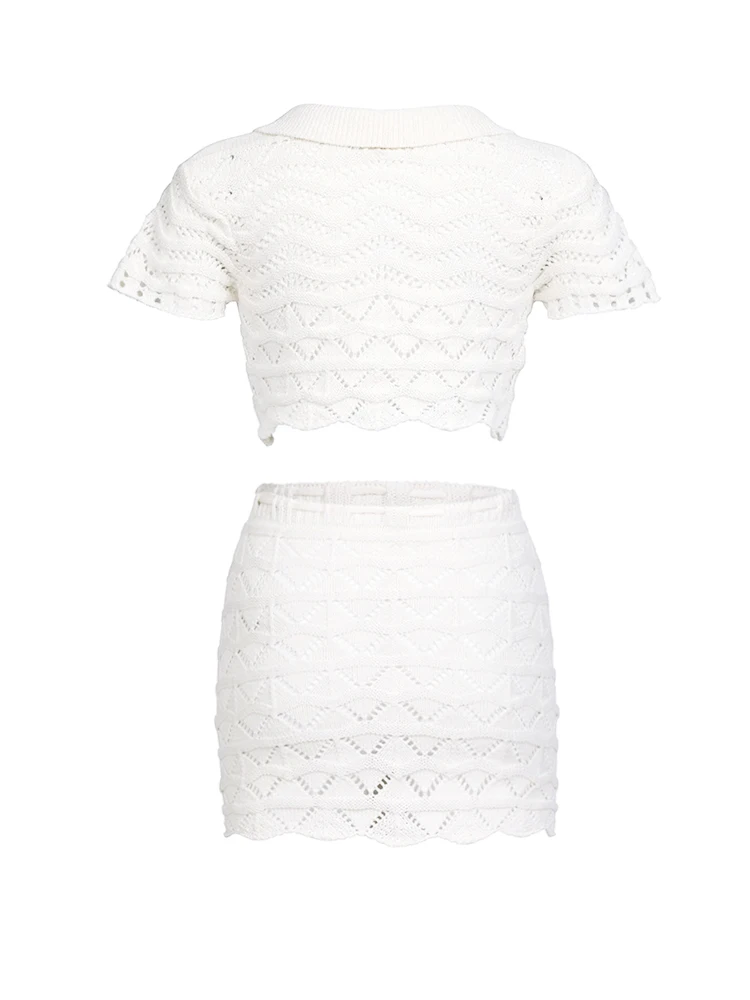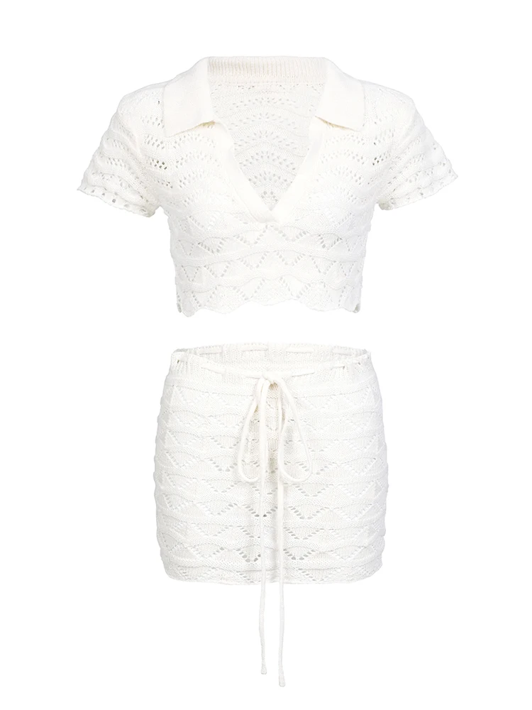 Introducing our Olympia Set. This dynamic duo features a cropped notched top and a matching crochet skirt, perfect for any occasion. Look effortlessly chic and stylish with this set.
