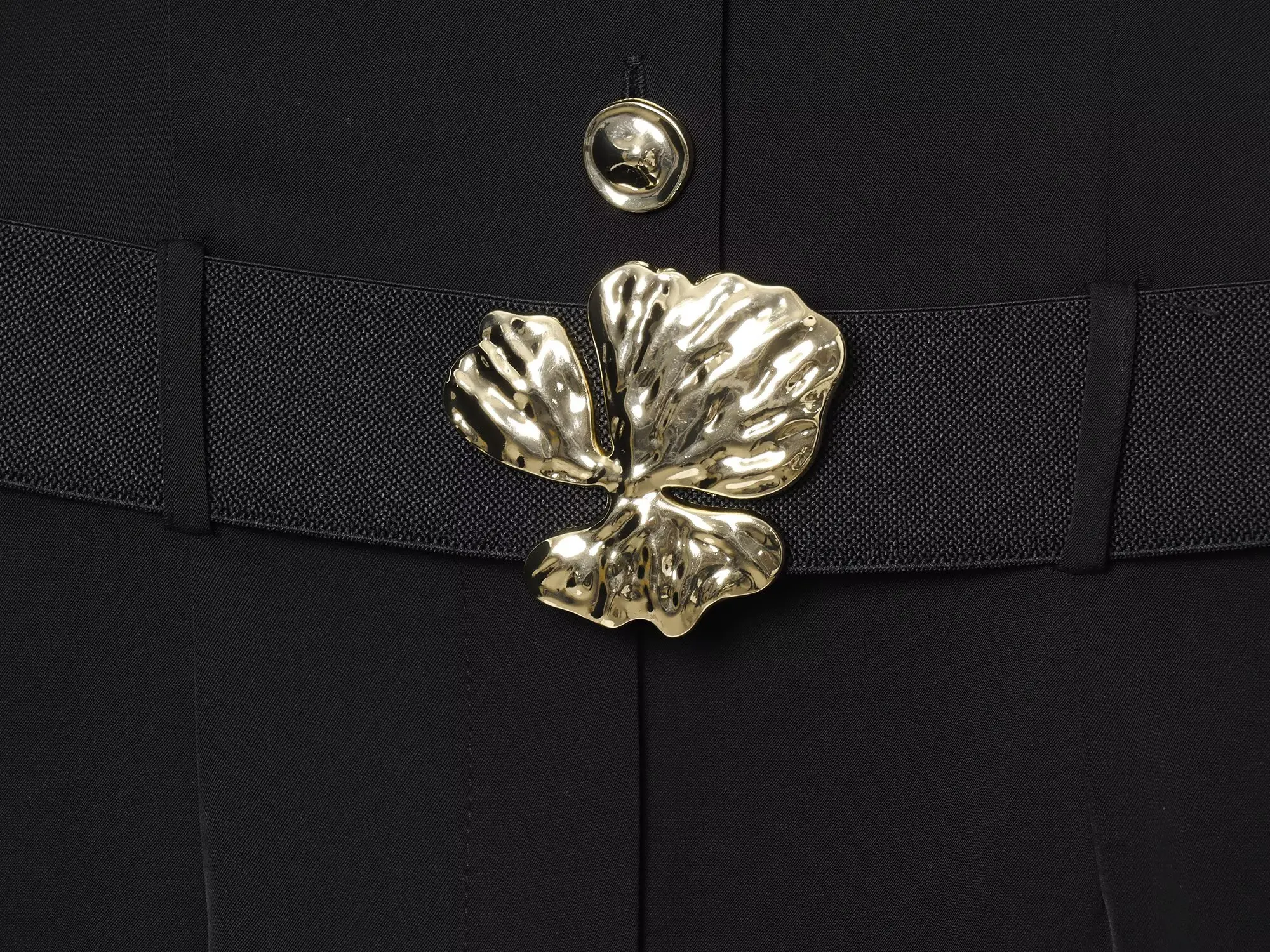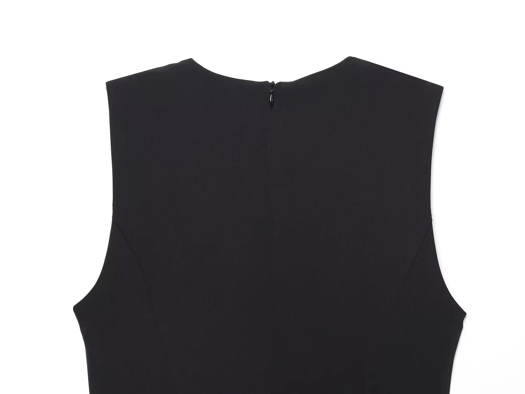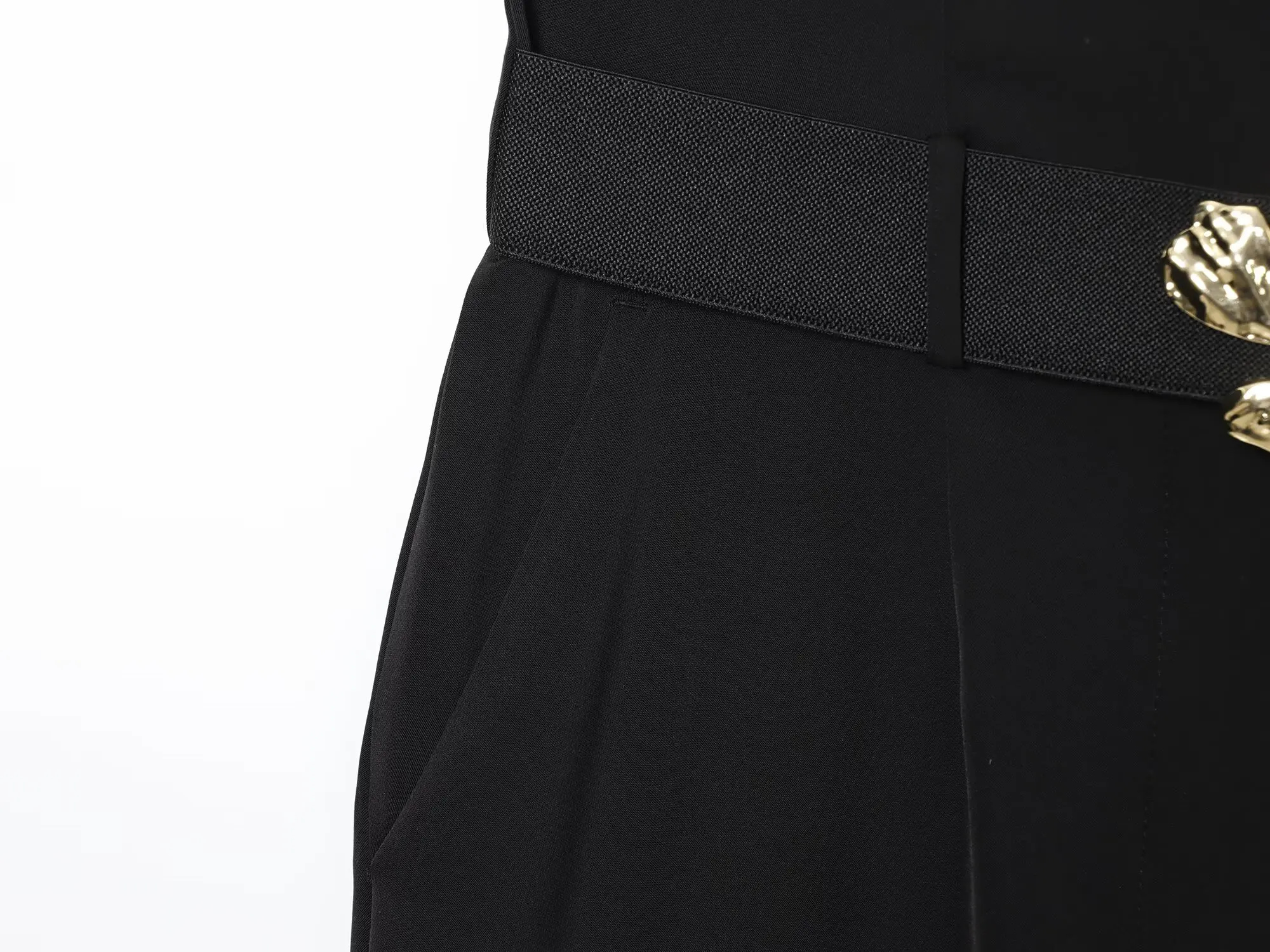 This stylish black jumpsuit combines a sleek O-neck design with sleeveless comfort, perfect for summer to fall transition. Accent details like buttons, a metallic belt, and a zipper add a chic, high-street edge to your look. Easy to wear and versatile, it elevates your wardrobe for casual outings or trendy events.